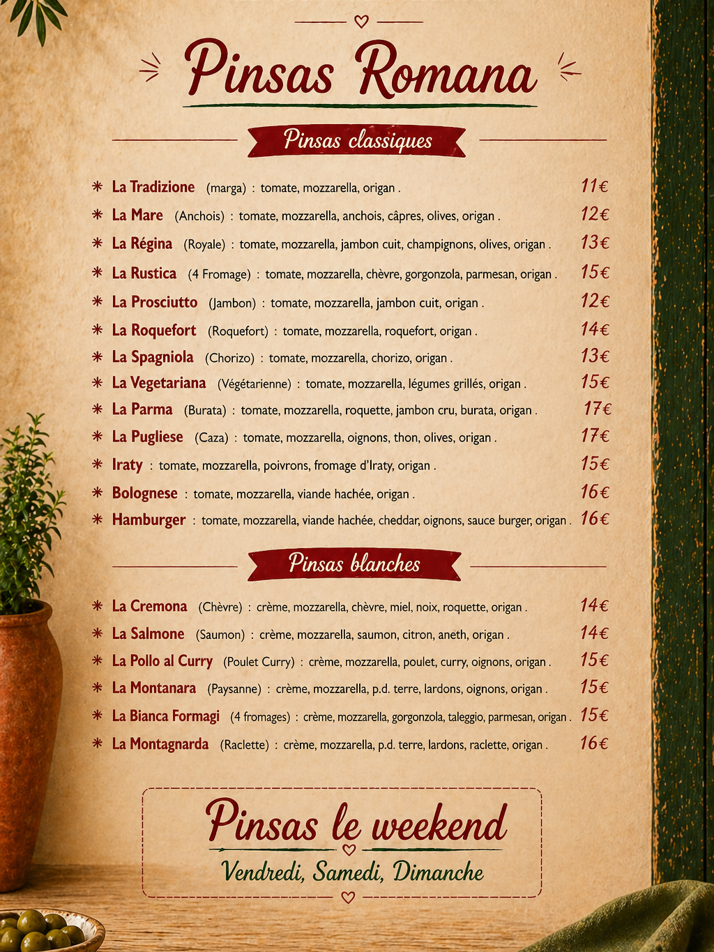 Des recettes classiques aux plus originales avec un choix également de Pinsas Romana, préparées chaque jour avec soin et passion.