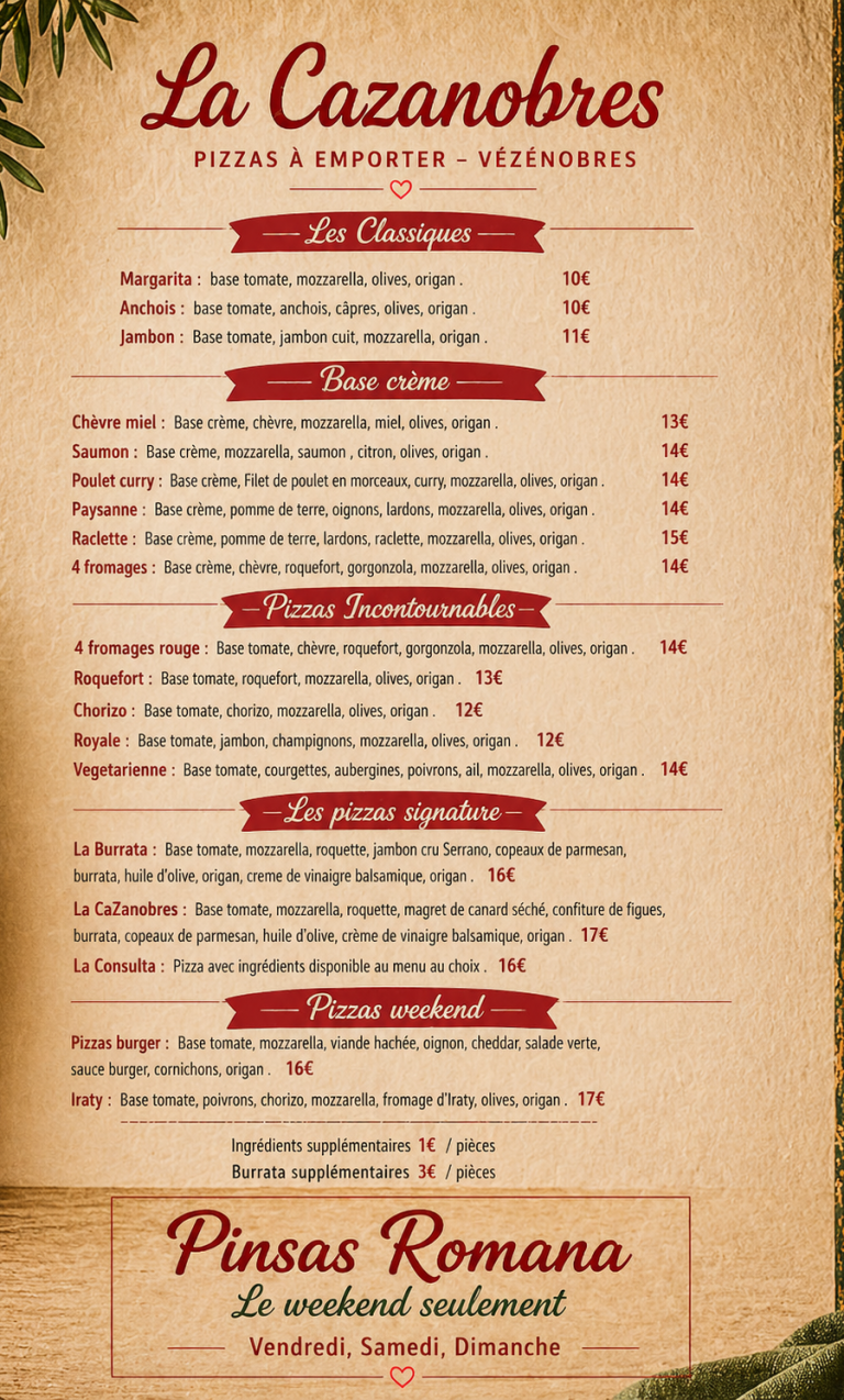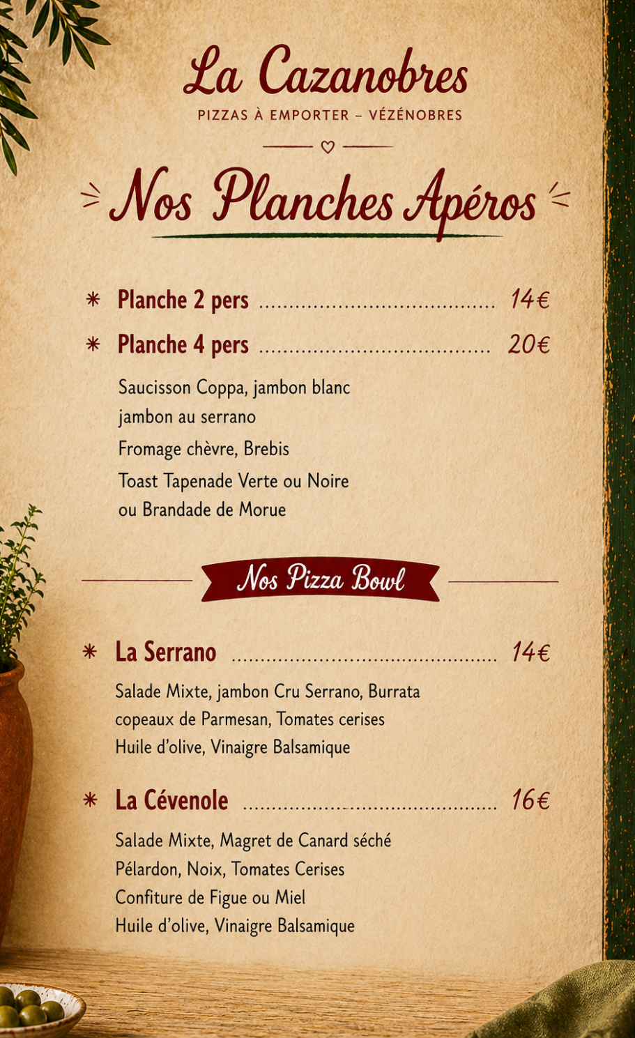 La CaZanobres propose un large choix de pizzas classiques et originales, de Pinsas Romana aux pâte légère et traditionnelle accompagnées de planches de charcuterie finement sélectionnées et salades fraîches. Le tout à emporter ou à déguster dans notre charmante cour ombragée.
